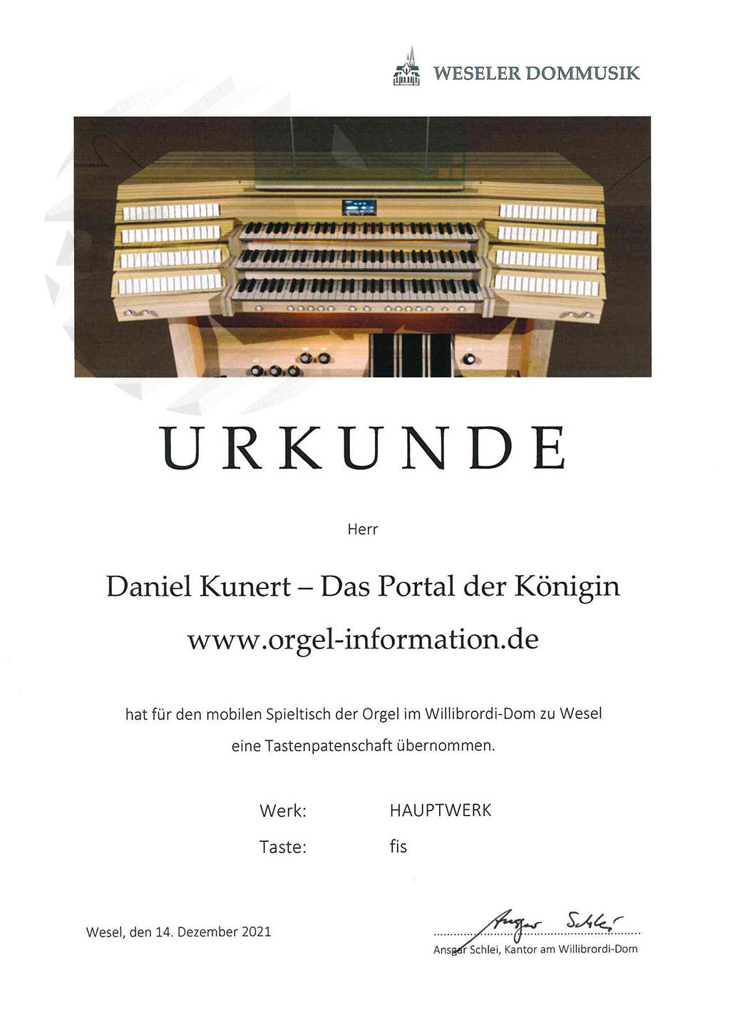 Wenn in einer Kirche viele Konzerte stattfinden, Besucher den Organisten auch einmal in Aktion sehen möchten und das Zusammenspiel mit Chören und Ensembles intensiviert werden soll, dann ist ein Spieltisch, der mobil und flexibel auf die verschiedenen Erfordernisse reagieren kann, sehr hilfreich. Und da man im Willibrordi-Dom zu Wesel viel Engagement im Konzertbereich zeigt, war es uns eine Freude, eine Tastenpatenschaft in Höhe von 75,- € zu übernehmen.
